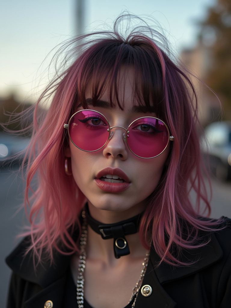 Alternative fashion, edgy attitude, street photography vibes. Pink-tinted glasses, dark choker, expressive pose . TikTok and Instagram style.