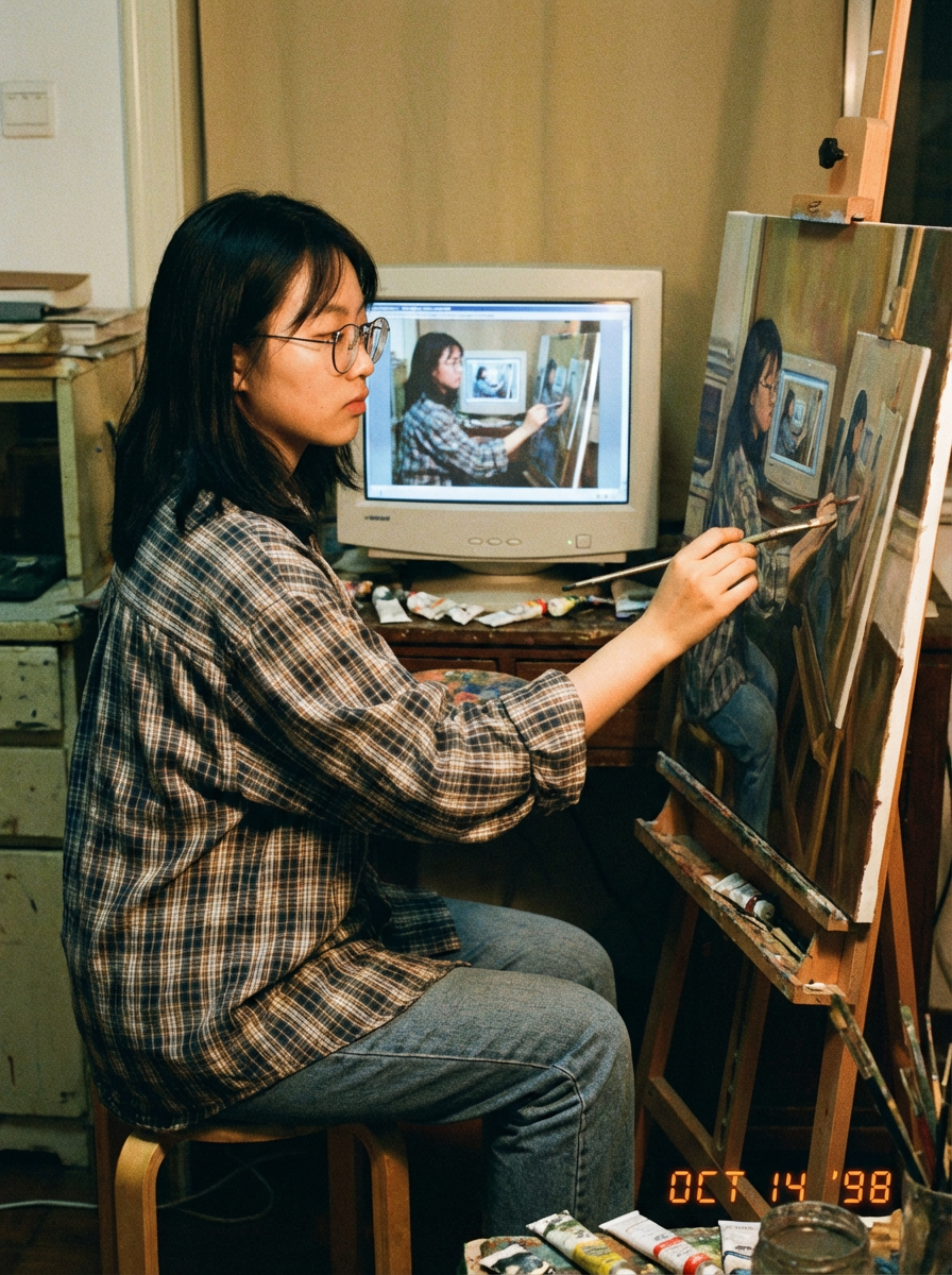 Amateur photograph from 1998 of model copying an image by hand from a computer screen to an oil painting on stretched canvas, but the image is itself the photo of the model painting the recursive image.
