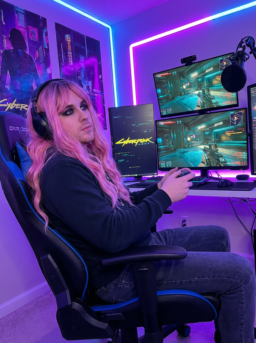amazingly detailed model, masterpiece, ultra hd, full shot, dynamic angle, beautiful girl, computer gamer, gaming computer, gaming chair, playing cyberpunk 2077, neon bedroom, streamer setup, , cyberpunk theme, wild long hair, Wavy Cut with Curtain Bangs, bubblegum pink hair, high detail hair, smokey eye shadow, high detail skin, high detail eyes, seductive eyes, smokey makeup