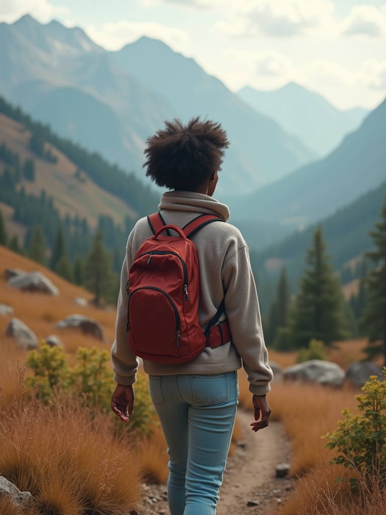 an adventurous feminine model hiking in the mountains