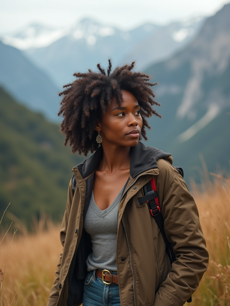 an adventurous feminine model hiking in the mountains