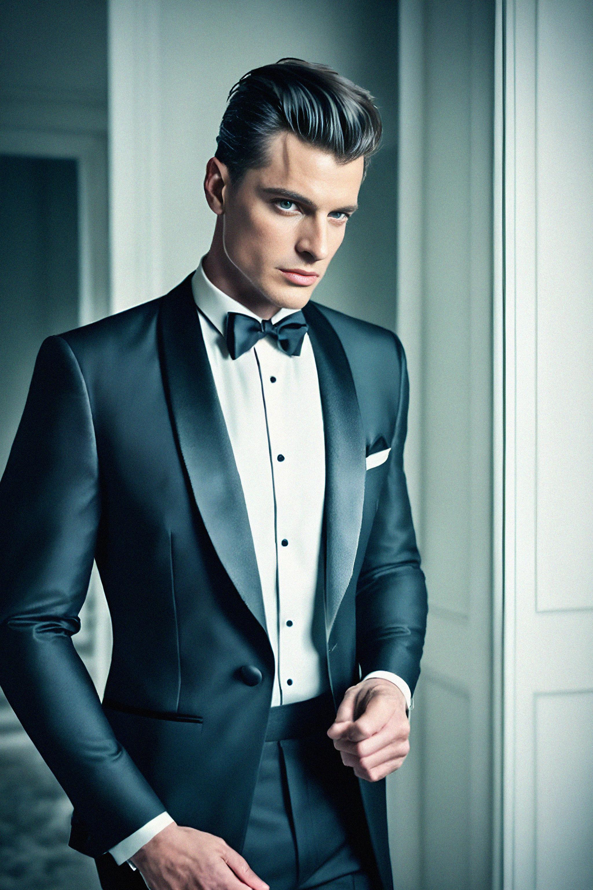 an alluring masculine model dressed in elegant evening wear, ready for a night out on the town