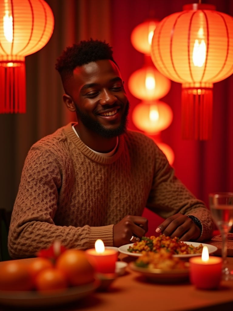 an incredibly attractive model during Chinese New Year evening celebrations, surrounded by glowing red lanterns, preparing for family reunion dinner with mandarin oranges and traditional foods on a beautifully decorated table