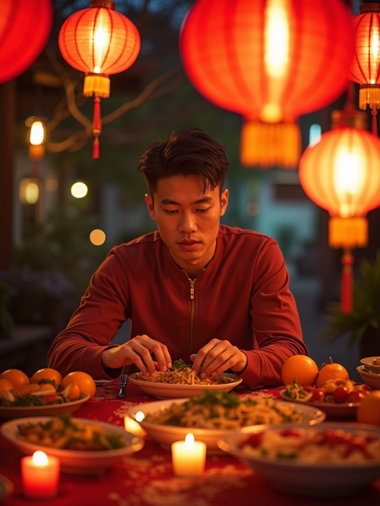 an incredibly attractive model during Chinese New Year evening celebrations, surrounded by glowing red lanterns, preparing for family reunion dinner with mandarin oranges and traditional foods on a beautifully decorated table