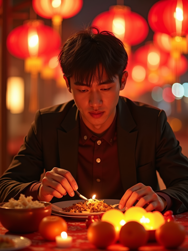 an incredibly attractive model during Chinese New Year evening celebrations, surrounded by glowing red lanterns, preparing for family reunion dinner with mandarin oranges and traditional foods on a beautifully decorated table