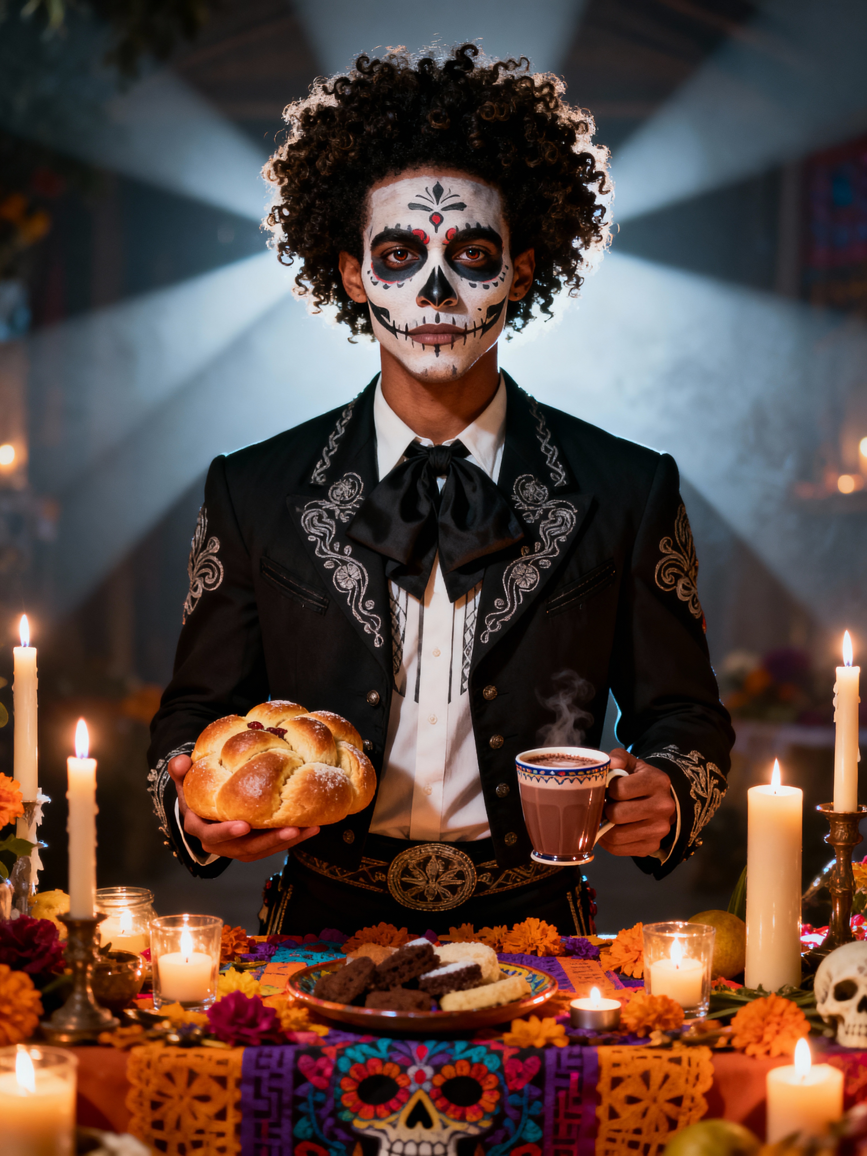 an incredibly attractive model during Día de los Muertos celebrations, surrounded by glowing candles and ofrendas, enjoying traditional pan de muerto and Mexican hot chocolate on a beautifully decorated altar