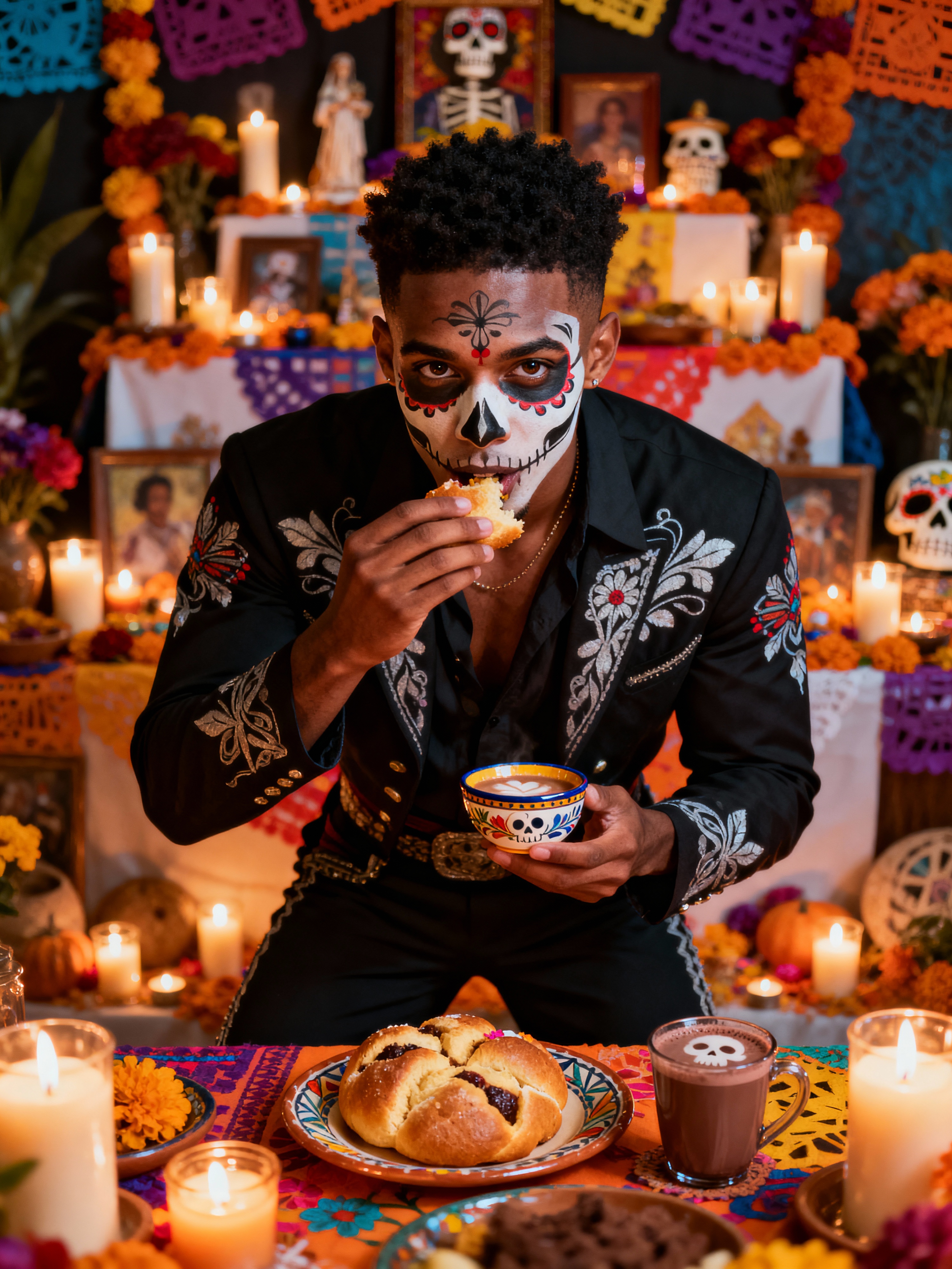 an incredibly attractive model during Día de los Muertos celebrations, surrounded by glowing candles and ofrendas, enjoying traditional pan de muerto and Mexican hot chocolate on a beautifully decorated altar