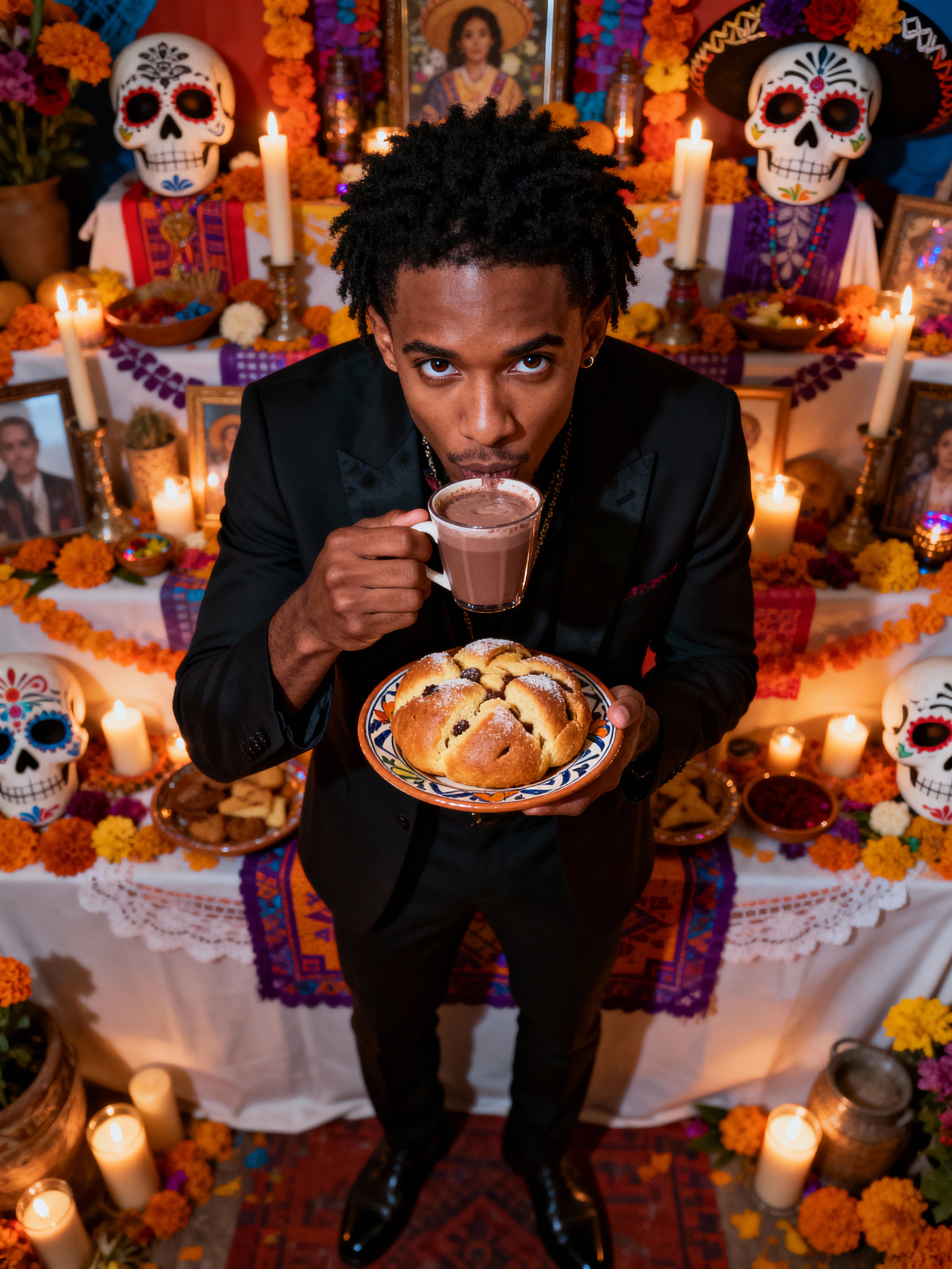 an incredibly attractive model during Día de los Muertos celebrations, surrounded by glowing candles and ofrendas, enjoying traditional pan de muerto and Mexican hot chocolate on a beautifully decorated altar