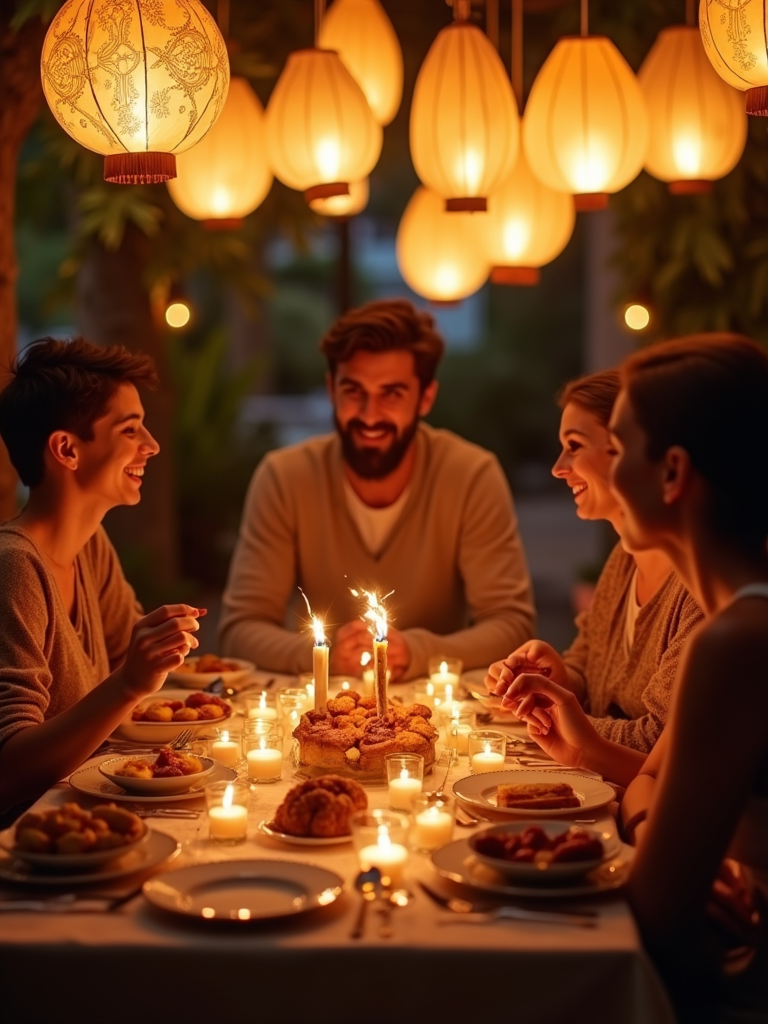 an incredibly attractive model during Eid celebrations, surrounded by glowing fanous lanterns, enjoying festive treats on a beautifully decorated table with family and friends