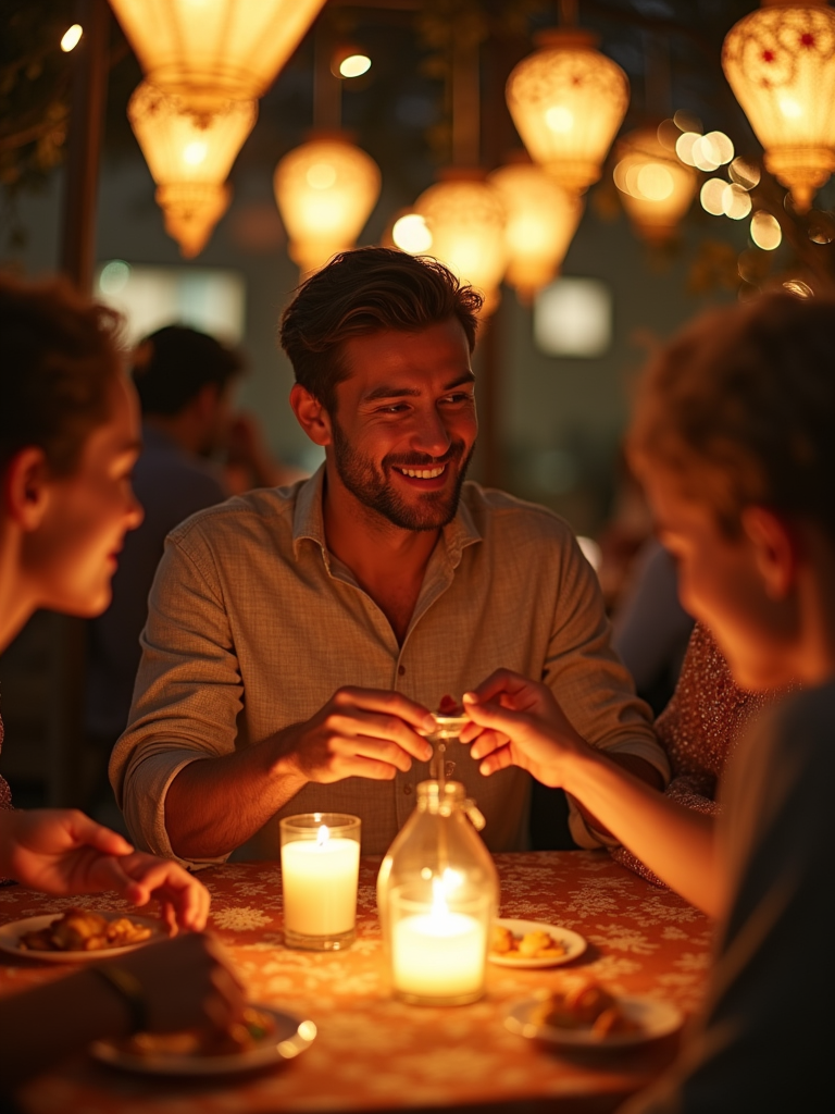 an incredibly attractive model during Eid celebrations, surrounded by glowing fanous lanterns, enjoying festive treats on a beautifully decorated table with family and friends