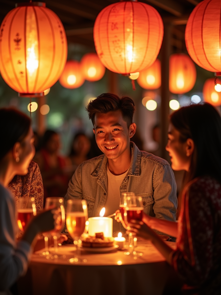 an incredibly attractive model during Eid celebrations, surrounded by glowing fanous lanterns, enjoying festive treats on a beautifully decorated table with family and friends
