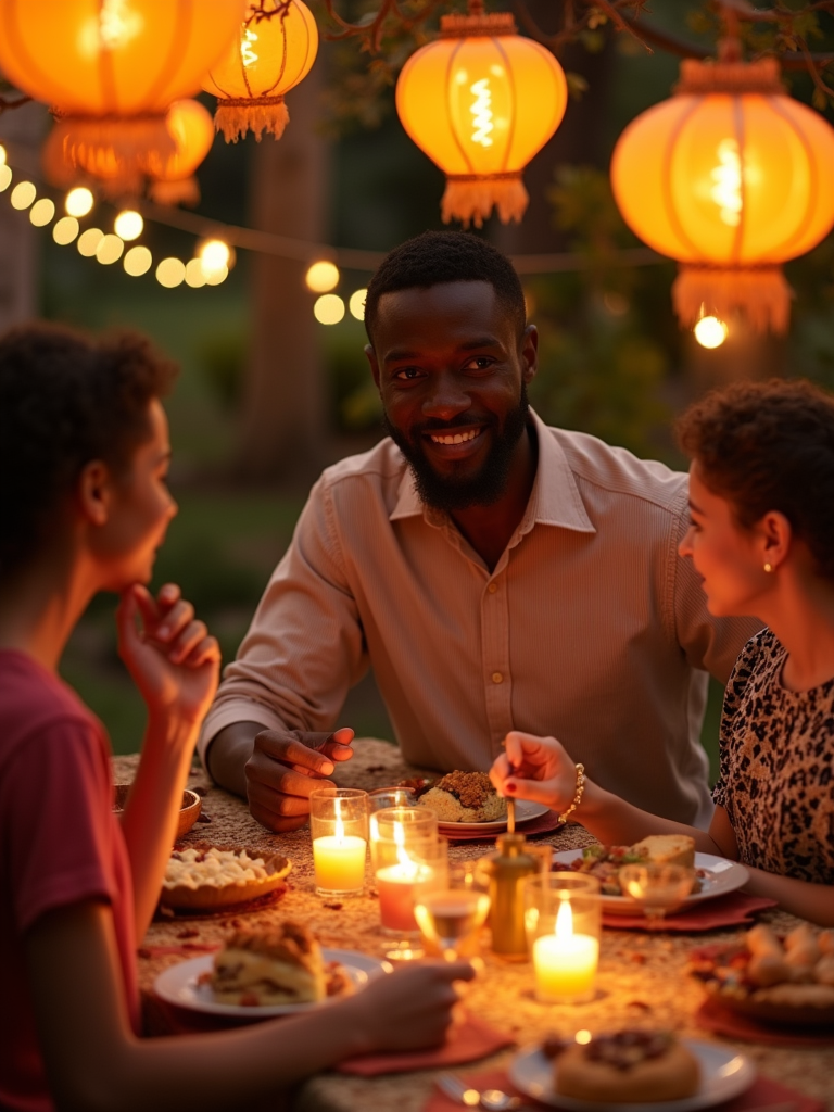 an incredibly attractive model during Eid celebrations, surrounded by glowing fanous lanterns, enjoying festive treats on a beautifully decorated table with family and friends
