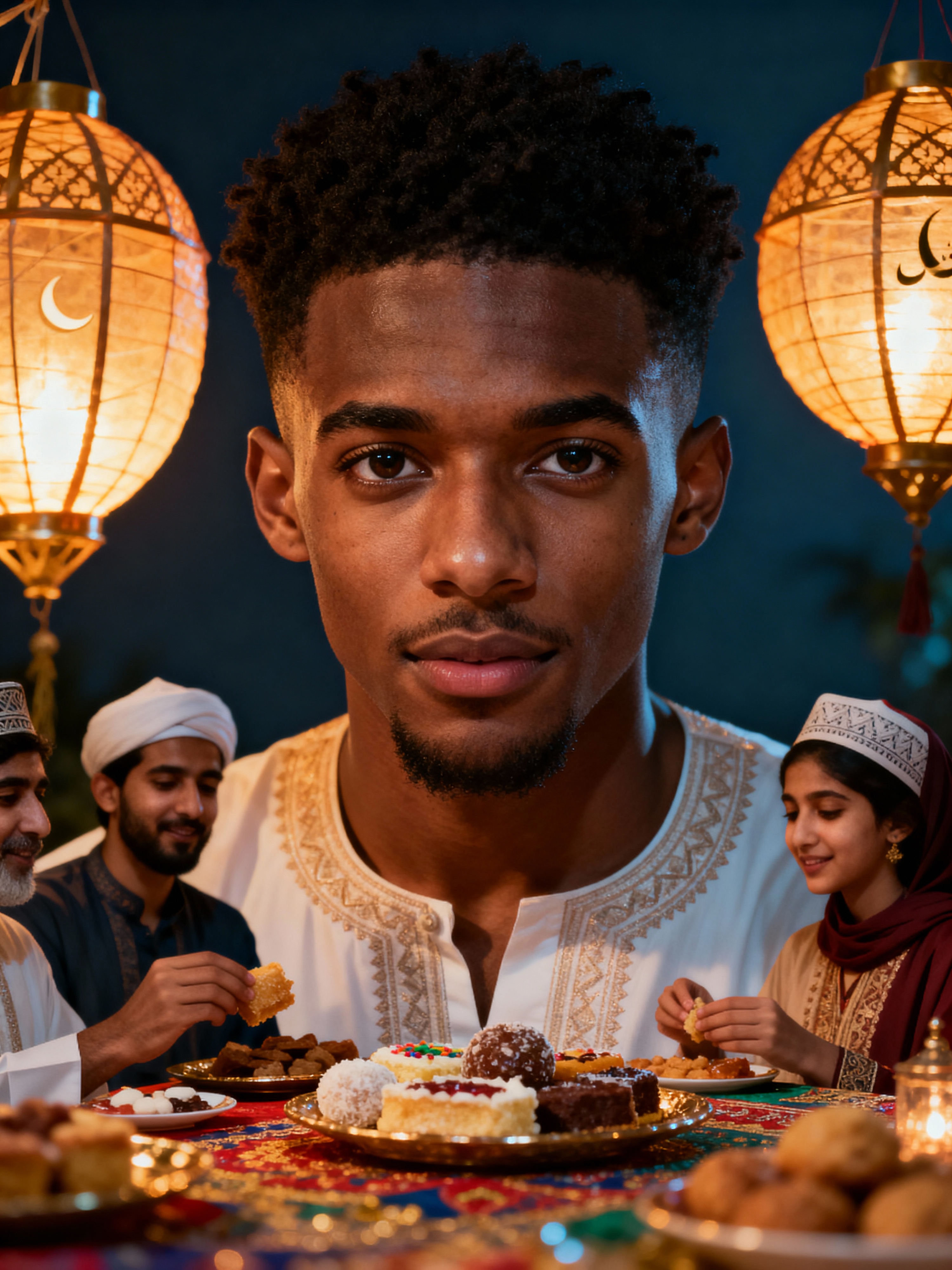 an incredibly attractive model during Eid celebrations, surrounded by glowing fanous lanterns, enjoying festive treats on a beautifully decorated table with family and friends