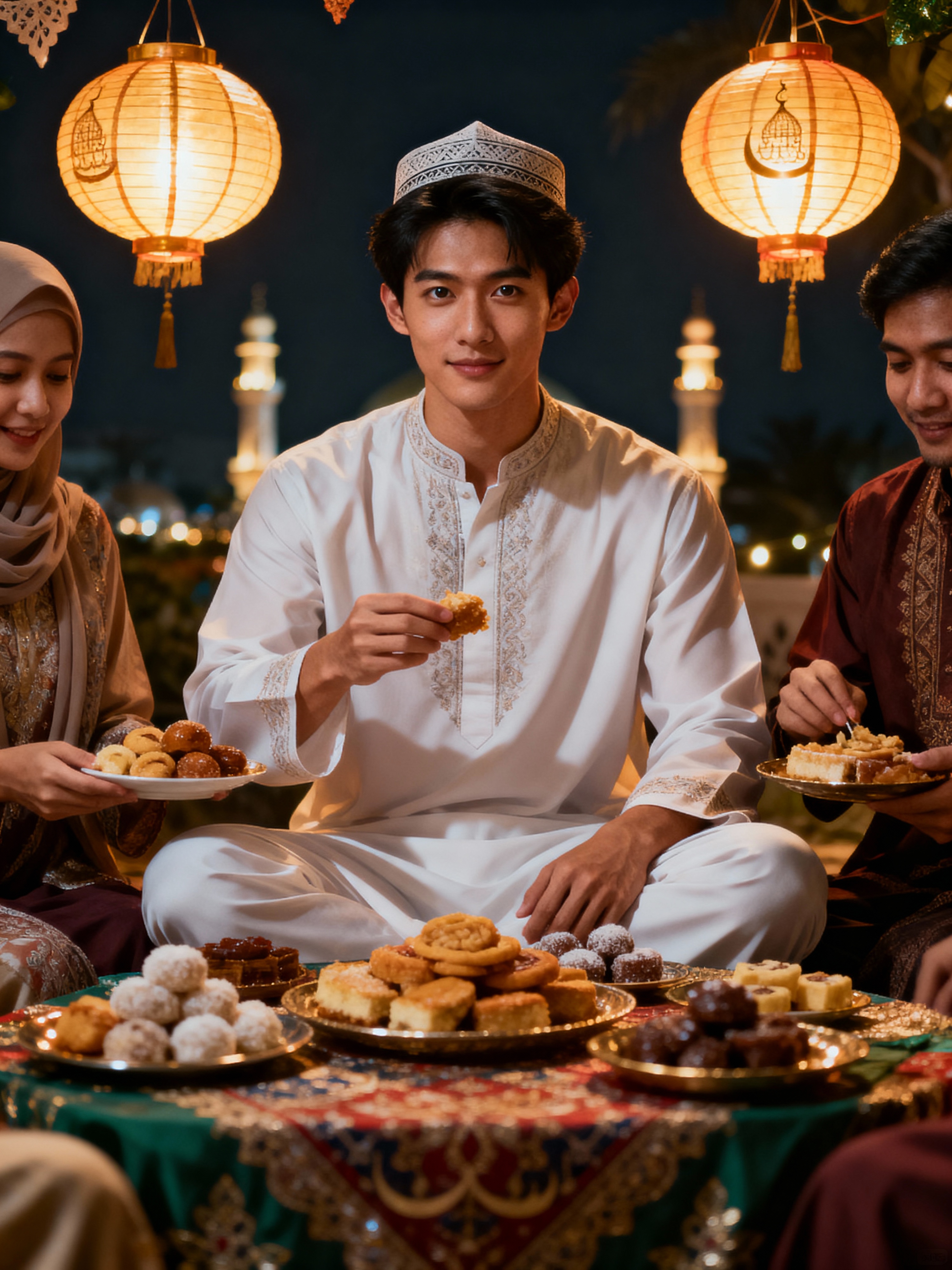 an incredibly attractive model during Eid celebrations, surrounded by glowing fanous lanterns, enjoying festive treats on a beautifully decorated table with family and friends