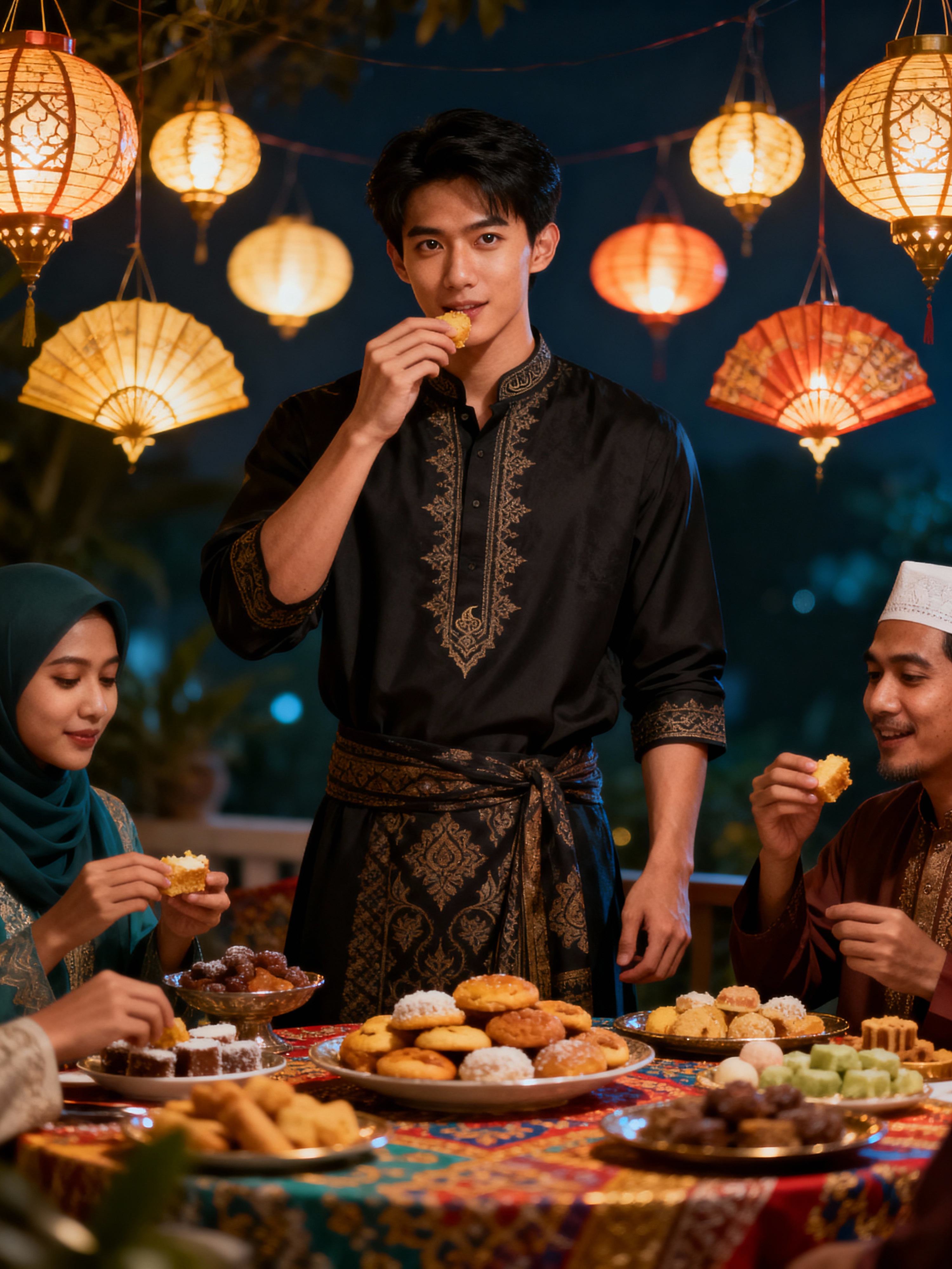 an incredibly attractive model during Eid celebrations, surrounded by glowing fanous lanterns, enjoying festive treats on a beautifully decorated table with family and friends