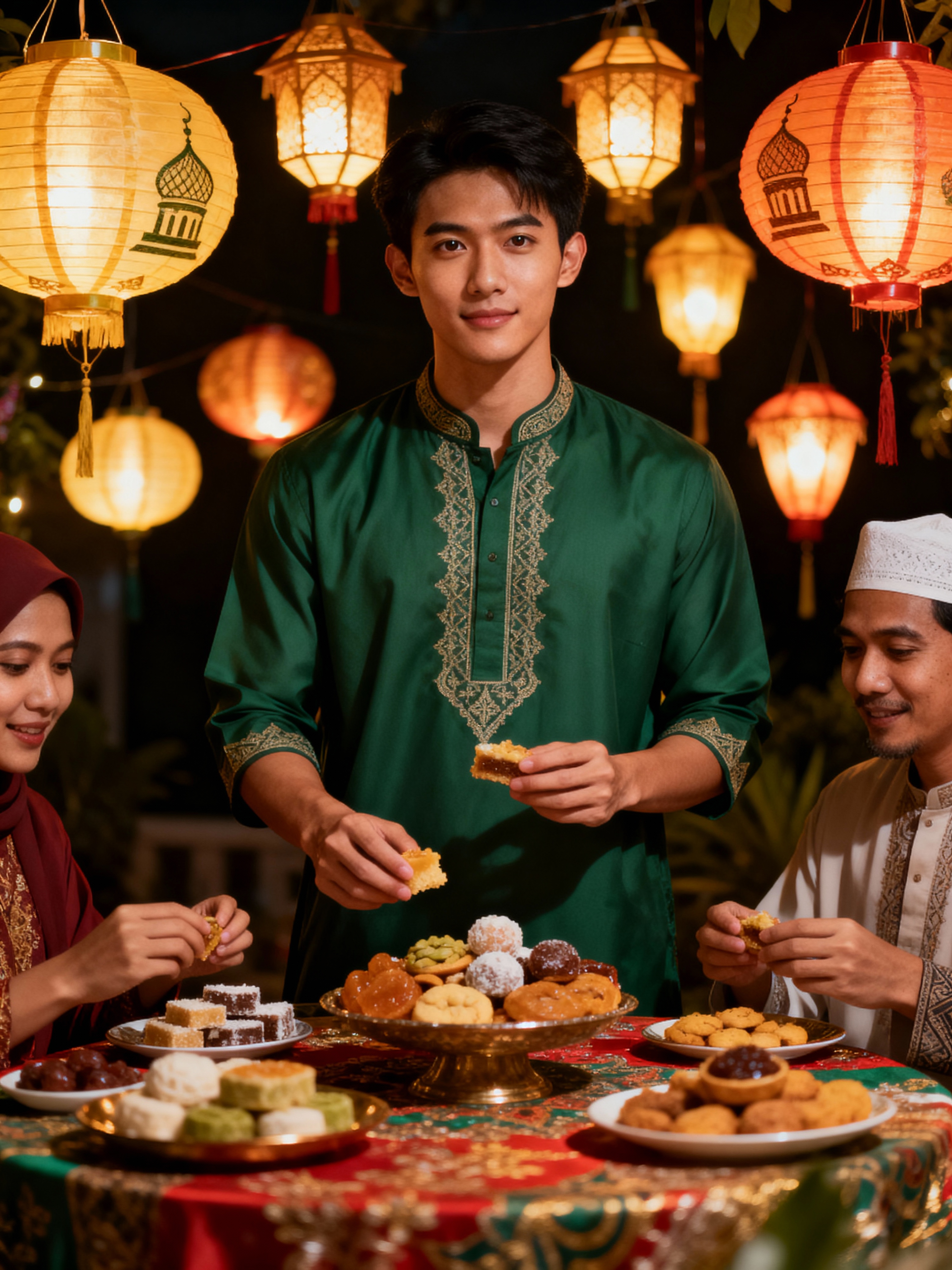 an incredibly attractive model during Eid celebrations, surrounded by glowing fanous lanterns, enjoying festive treats on a beautifully decorated table with family and friends