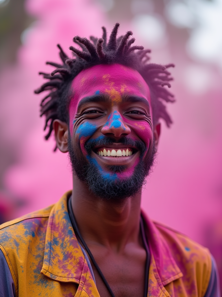 an incredibly attractive model during Holi celebrations, face and clothes covered with pink, blue, and yellow powders, smiling radiantly in the midst of color clouds