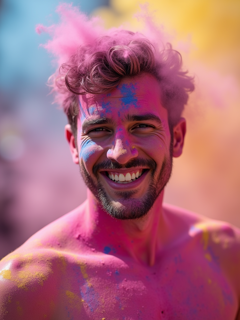 an incredibly attractive model during Holi celebrations, face and clothes covered with pink, blue, and yellow powders, smiling radiantly in the midst of color clouds