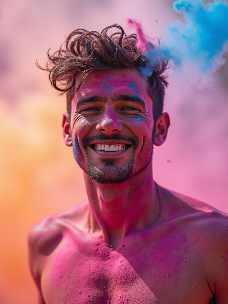 an incredibly attractive model during Holi celebrations, face and clothes covered with pink, blue, and yellow powders, smiling radiantly in the midst of color clouds