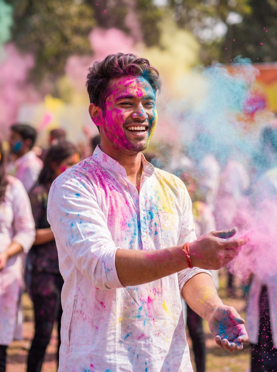an incredibly attractive model during Holi celebrations, face and clothes covered with pink, blue, and yellow powders, smiling radiantly in the midst of color clouds