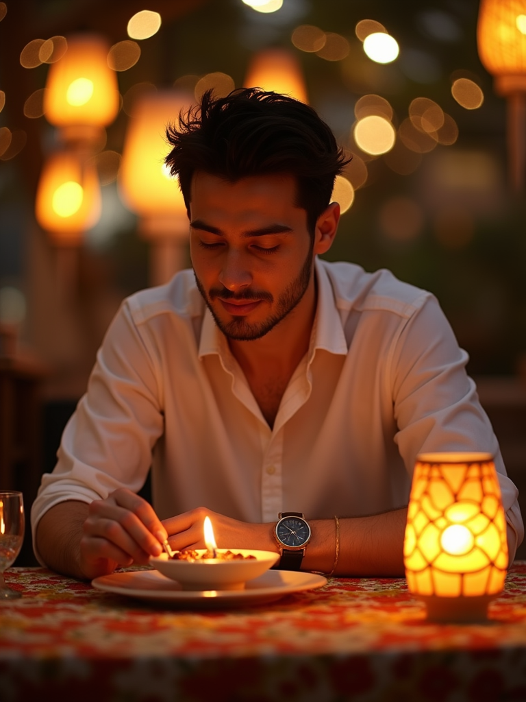 an incredibly attractive model during Ramadan evening celebrations, surrounded by glowing fanous lanterns, preparing for iftar with dates and water on a beautifully decorated table