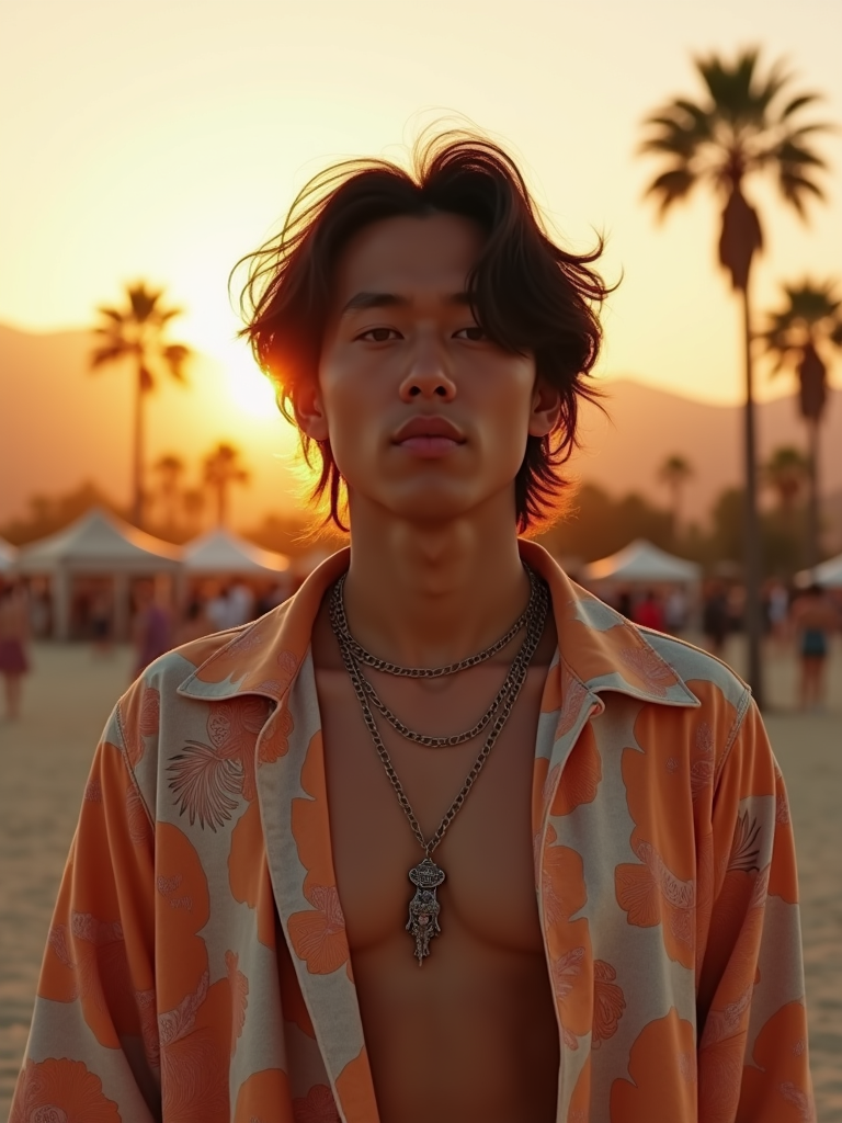 an incredibly attractive model in a Coachella outfit, embracing the desert festival vibes and posing against a backdrop of palm trees and mountains at sunset in Indio, California