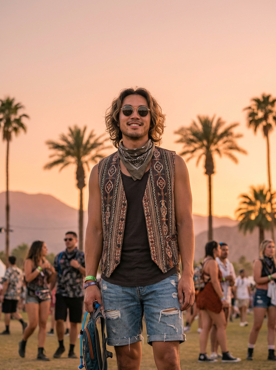 an incredibly attractive model in a Coachella outfit, embracing the desert festival vibes and posing against a backdrop of palm trees and mountains at sunset in Indio, California