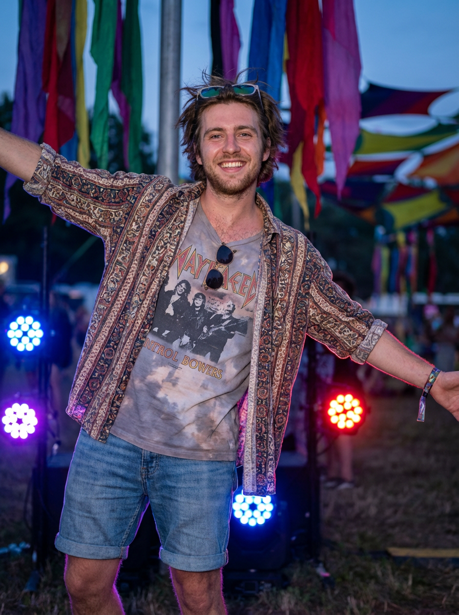an incredibly attractive model in a festival outfit, embracing the festival vibes and posing against a backdrop of colorful stage lights and decorations
