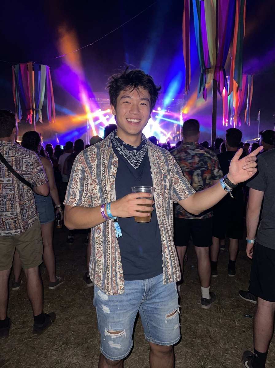 an incredibly attractive model in a festival outfit, embracing the festival vibes and posing against a backdrop of colorful stage lights and decorations