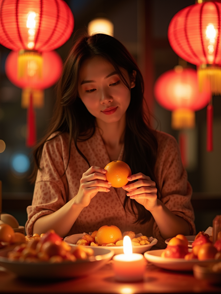 an incredibly attractive model during Chinese New Year evening celebrations, surrounded by glowing red lanterns, preparing for family reunion dinner with mandarin oranges and traditional foods on a beautifully decorated table