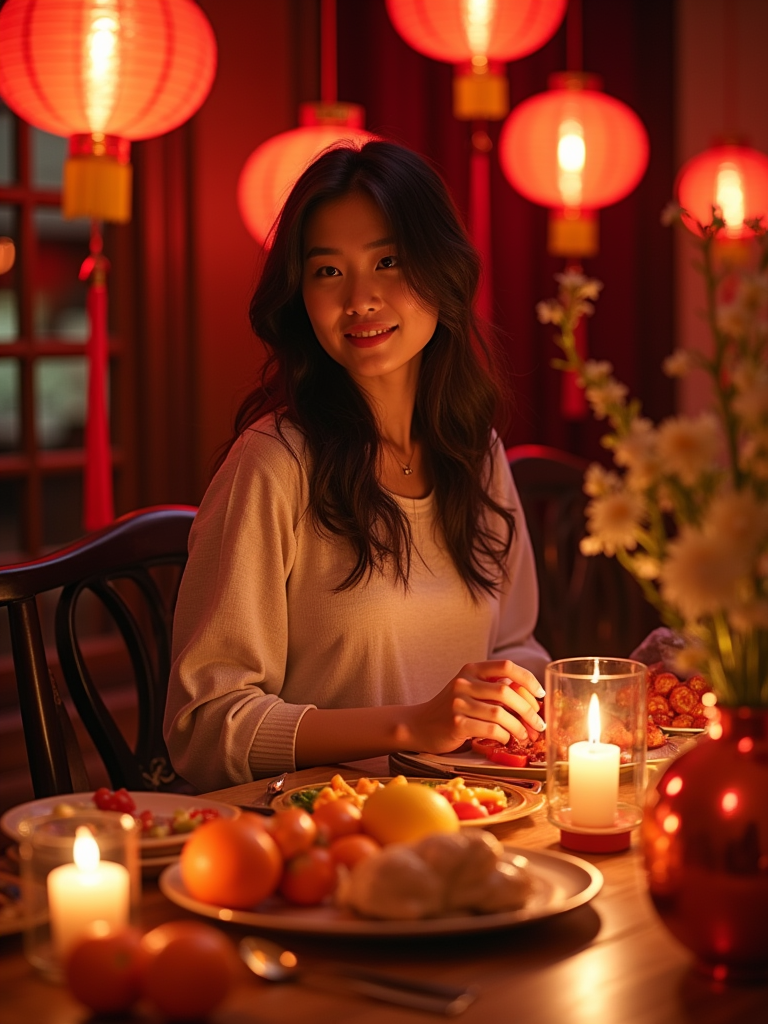 an incredibly attractive model during Chinese New Year evening celebrations, surrounded by glowing red lanterns, preparing for family reunion dinner with mandarin oranges and traditional foods on a beautifully decorated table