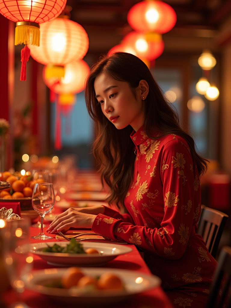 an incredibly attractive model during Chinese New Year evening celebrations, surrounded by glowing red lanterns, preparing for family reunion dinner with mandarin oranges and traditional foods on a beautifully decorated table