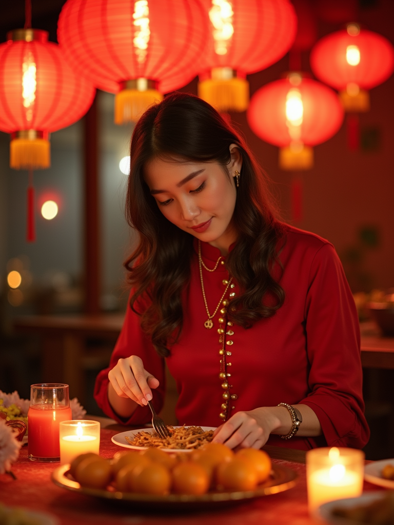 an incredibly attractive model during Chinese New Year evening celebrations, surrounded by glowing red lanterns, preparing for family reunion dinner with mandarin oranges and traditional foods on a beautifully decorated table