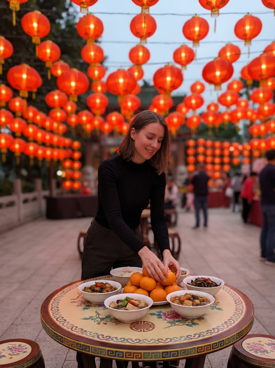 an incredibly attractive model during Chinese New Year evening celebrations, surrounded by glowing red lanterns, preparing for family reunion dinner with mandarin oranges and traditional foods on a beautifully decorated table