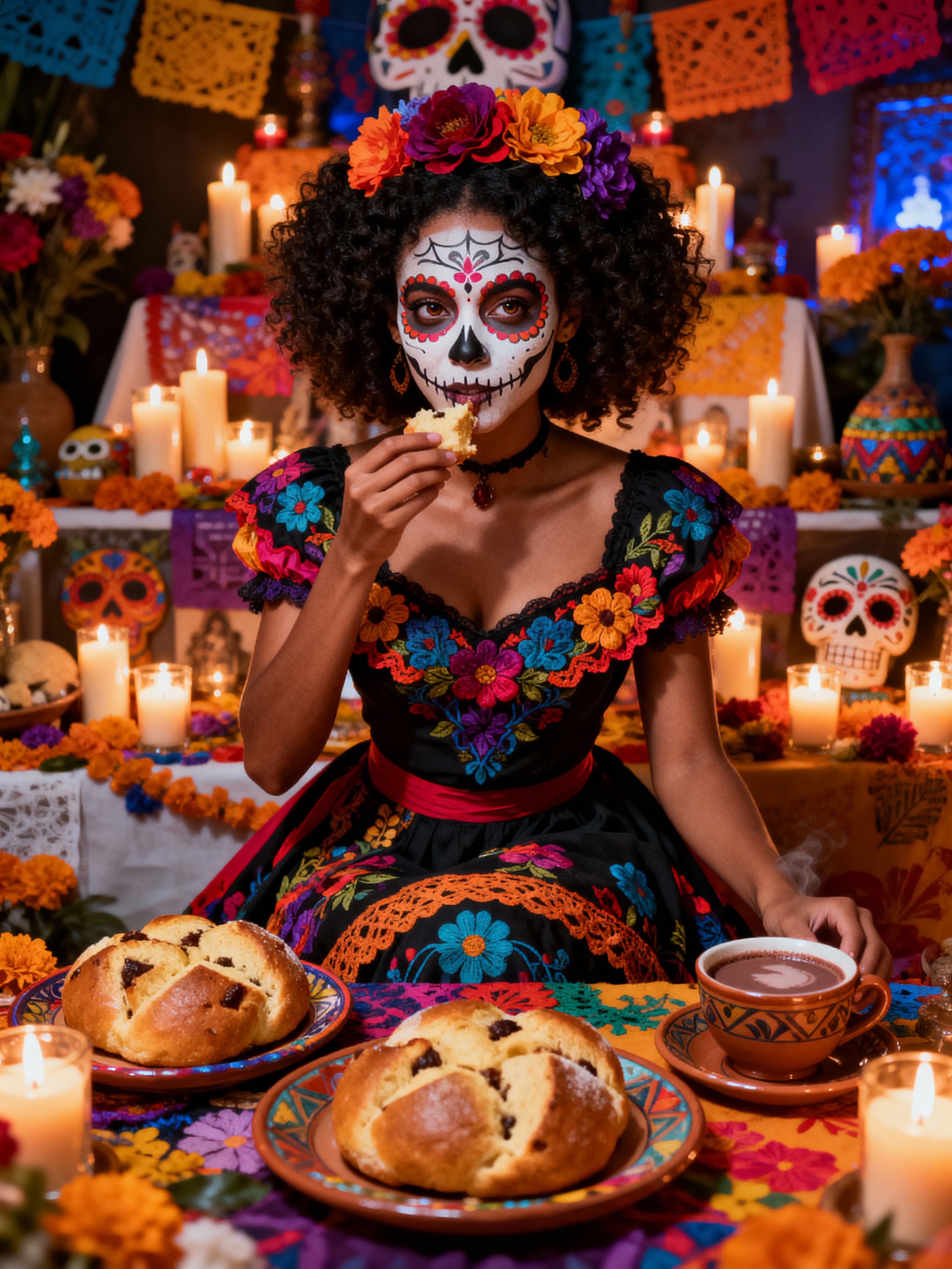 an incredibly attractive model during Día de los Muertos celebrations, surrounded by glowing candles and ofrendas, enjoying traditional pan de muerto and Mexican hot chocolate on a beautifully decorated altar
