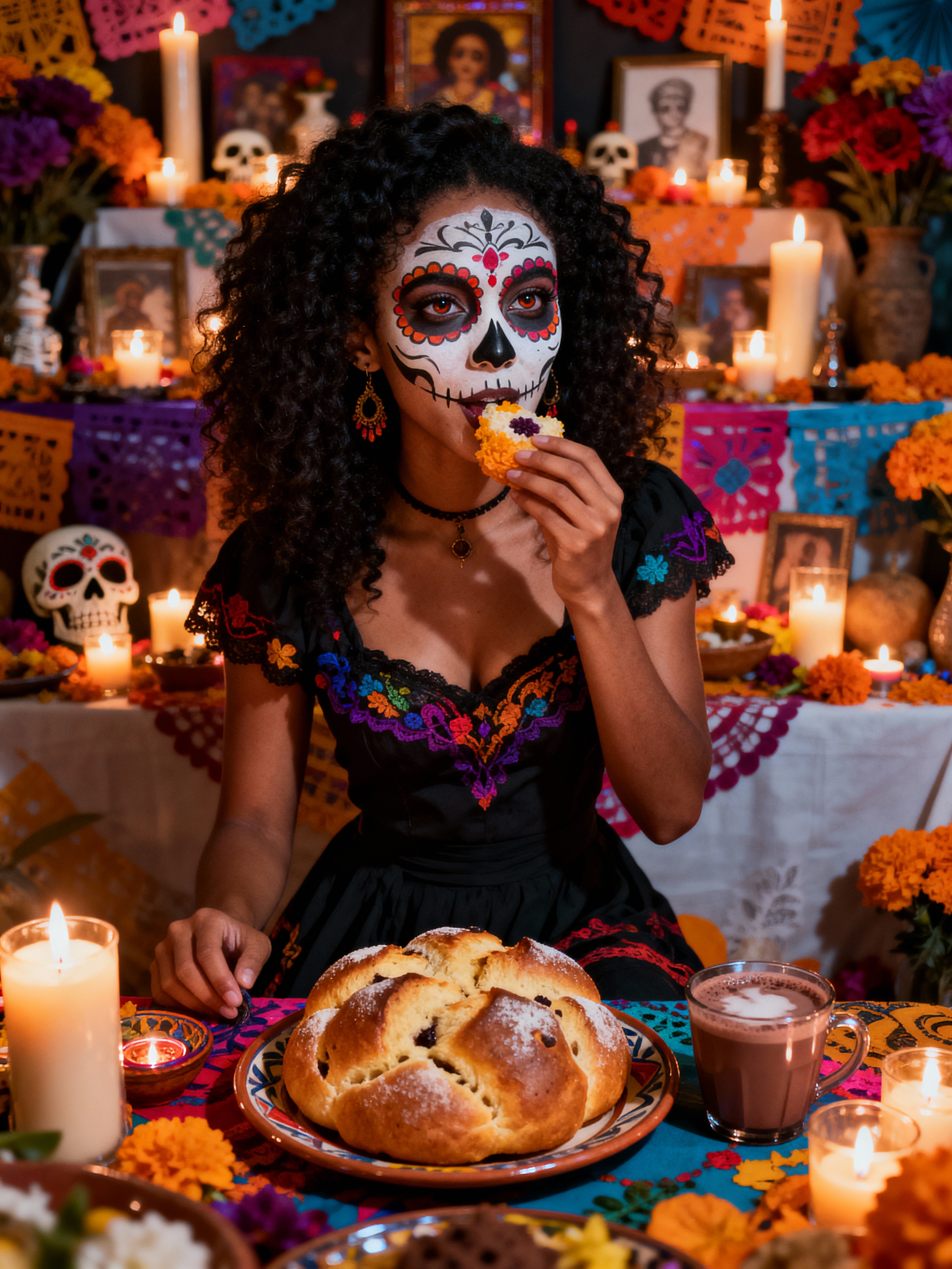 an incredibly attractive model during Día de los Muertos celebrations, surrounded by glowing candles and ofrendas, enjoying traditional pan de muerto and Mexican hot chocolate on a beautifully decorated altar