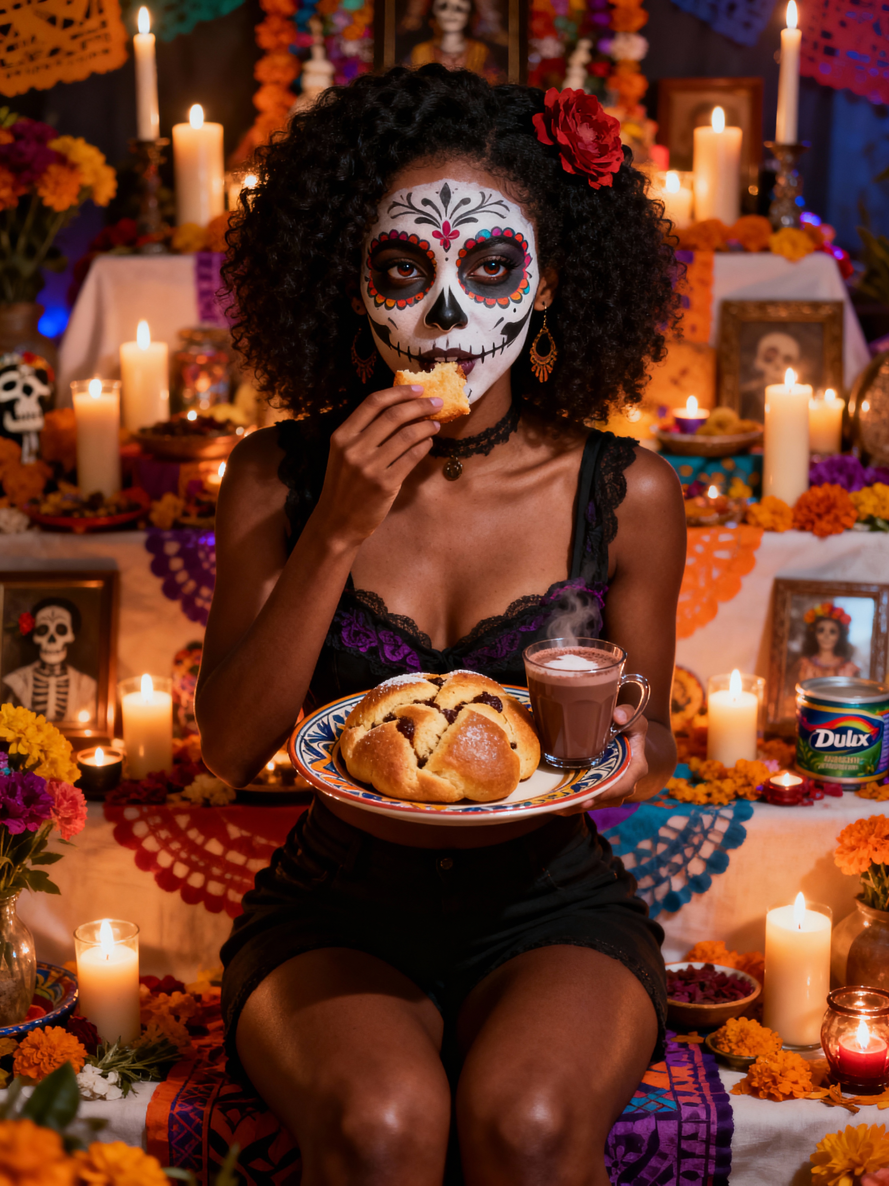 an incredibly attractive model during Día de los Muertos celebrations, surrounded by glowing candles and ofrendas, enjoying traditional pan de muerto and Mexican hot chocolate on a beautifully decorated altar