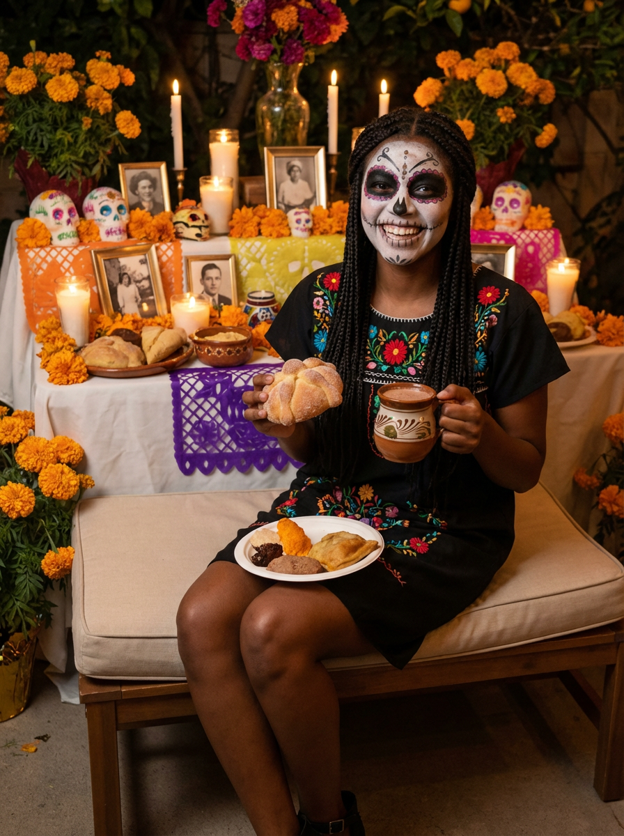 an incredibly attractive model during Día de los Muertos celebrations, surrounded by glowing candles and ofrendas, enjoying traditional pan de muerto and Mexican hot chocolate on a beautifully decorated altar