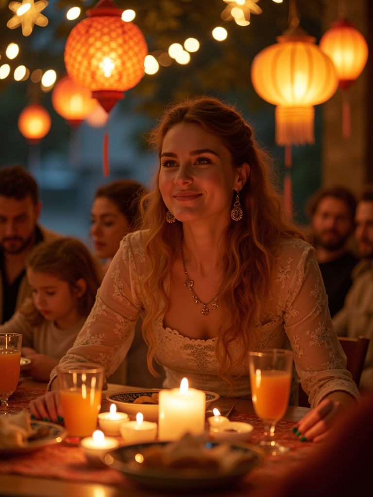 an incredibly attractive model during Eid celebrations, surrounded by glowing fanous lanterns, enjoying festive treats on a beautifully decorated table with family and friends