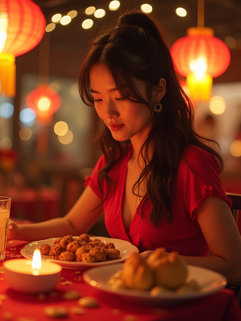 an incredibly attractive model during Eid celebrations, surrounded by glowing fanous lanterns, enjoying festive treats on a beautifully decorated table with family and friends
