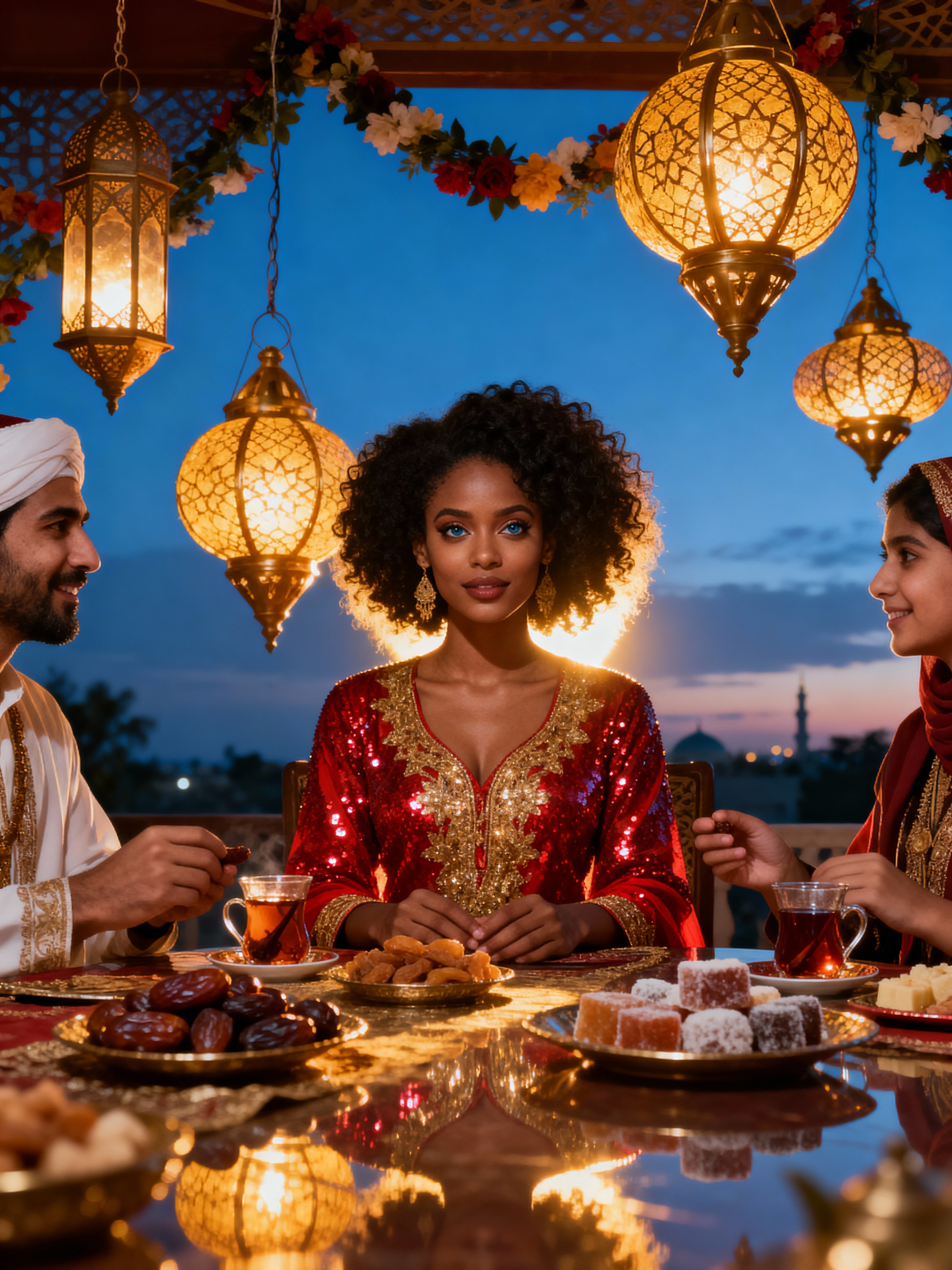an incredibly attractive model during Eid celebrations, surrounded by glowing fanous lanterns, enjoying festive treats on a beautifully decorated table with family and friends