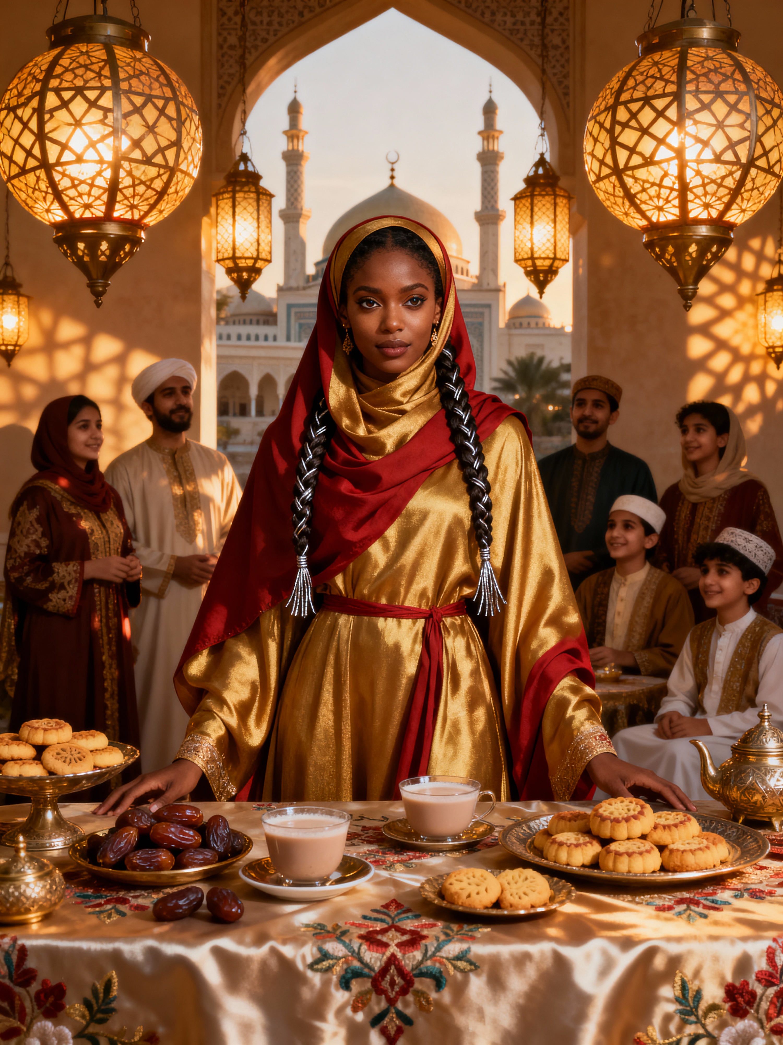 an incredibly attractive model during Eid celebrations, surrounded by glowing fanous lanterns, enjoying festive treats on a beautifully decorated table with family and friends
