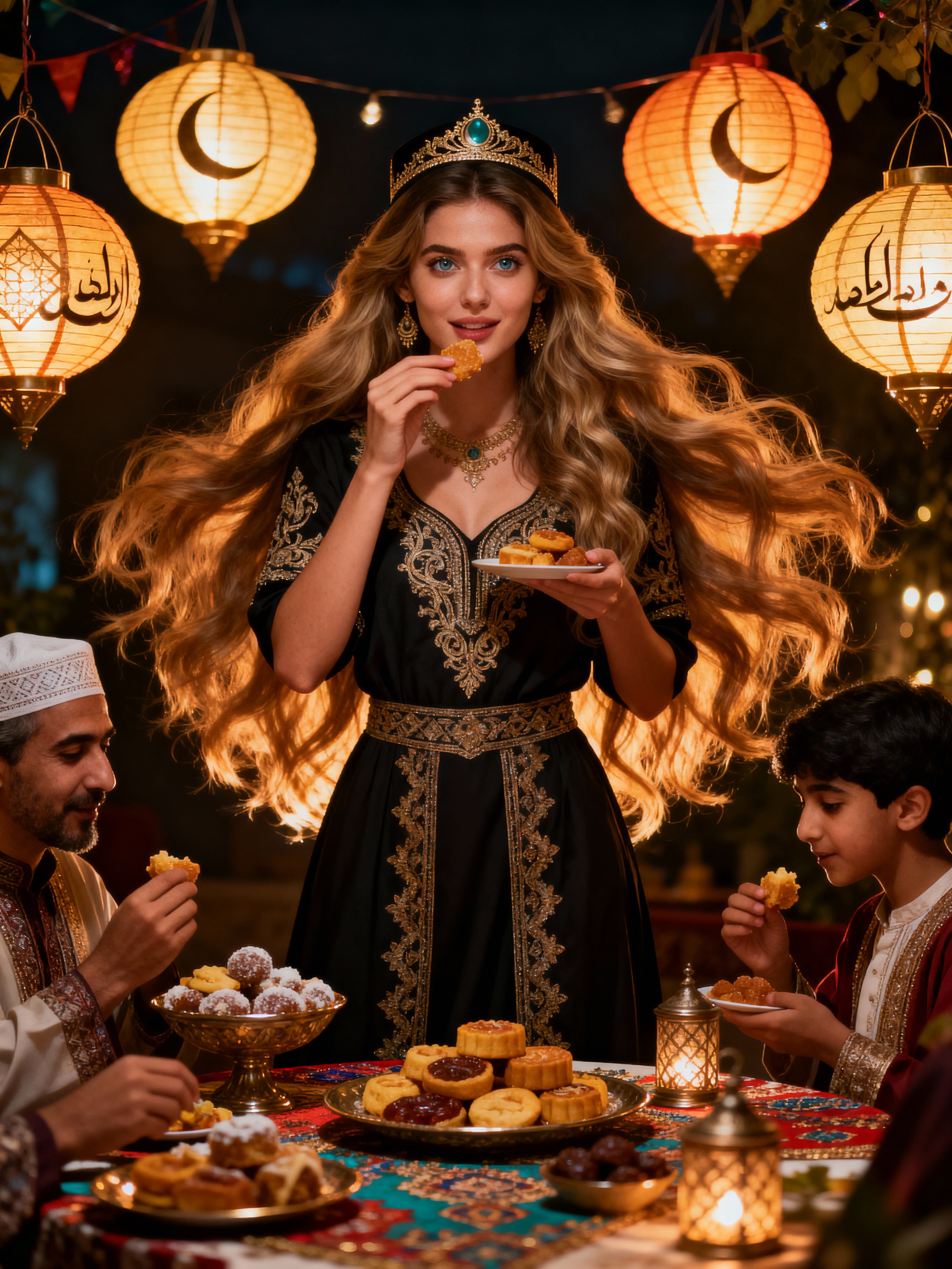 an incredibly attractive model during Eid celebrations, surrounded by glowing fanous lanterns, enjoying festive treats on a beautifully decorated table with family and friends