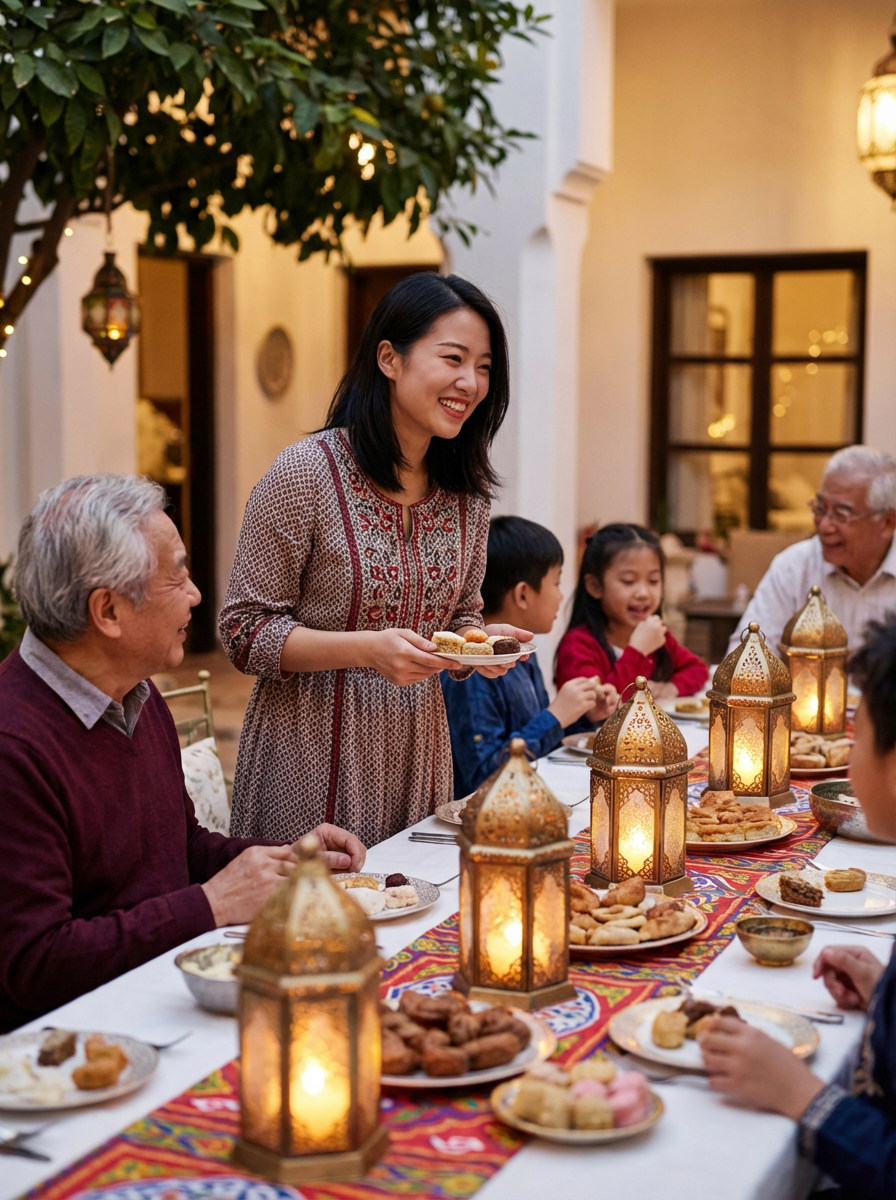 an incredibly attractive model during Eid celebrations, surrounded by glowing fanous lanterns, enjoying festive treats on a beautifully decorated table with family and friends