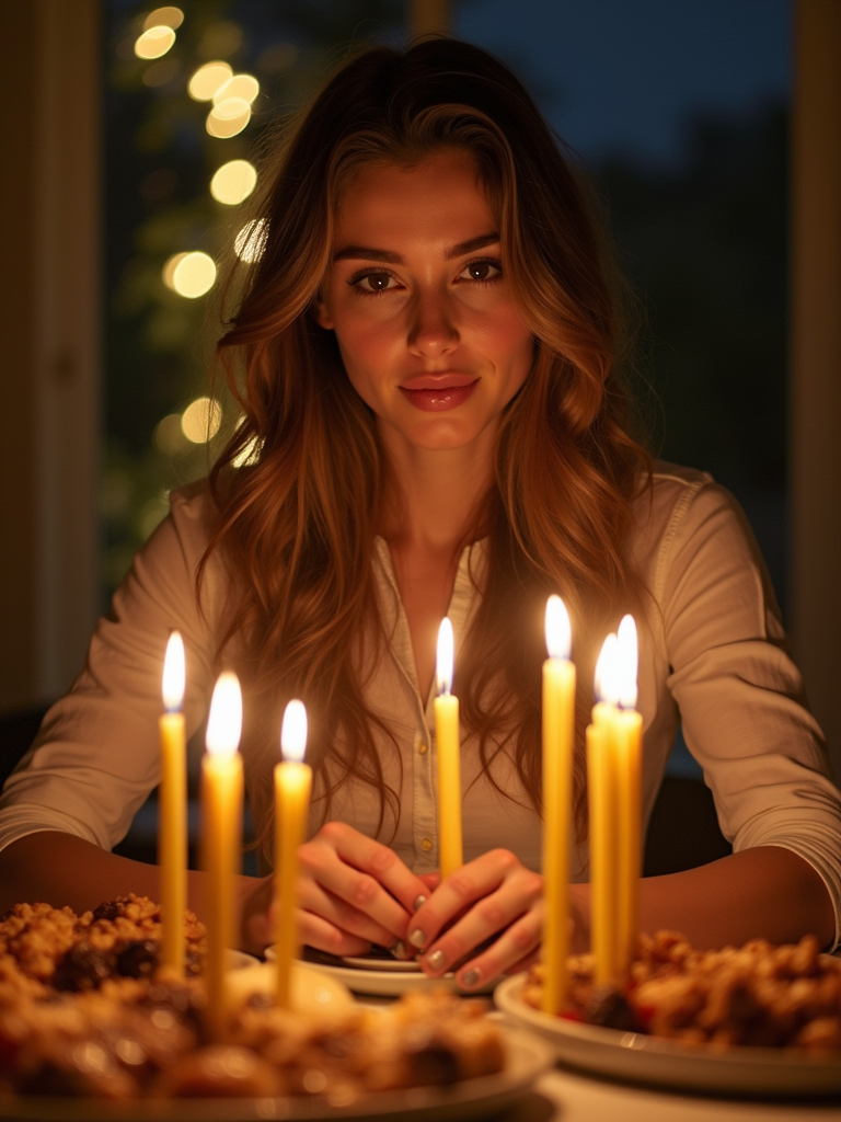 an incredibly attractive model during Hanukkah evening celebrations, surrounded by glowing candles, preparing for family gathering with traditional foods on a beautifully decorated table