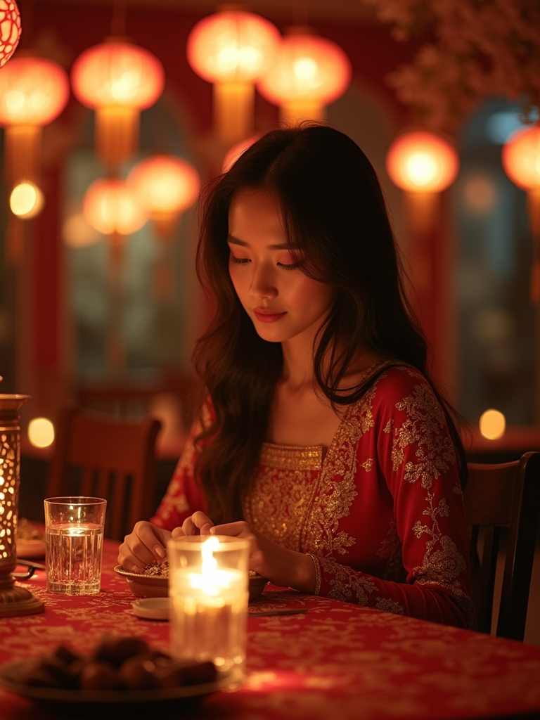 an incredibly attractive model during Ramadan evening celebrations, surrounded by glowing fanous lanterns, preparing for iftar with dates and water on a beautifully decorated table
