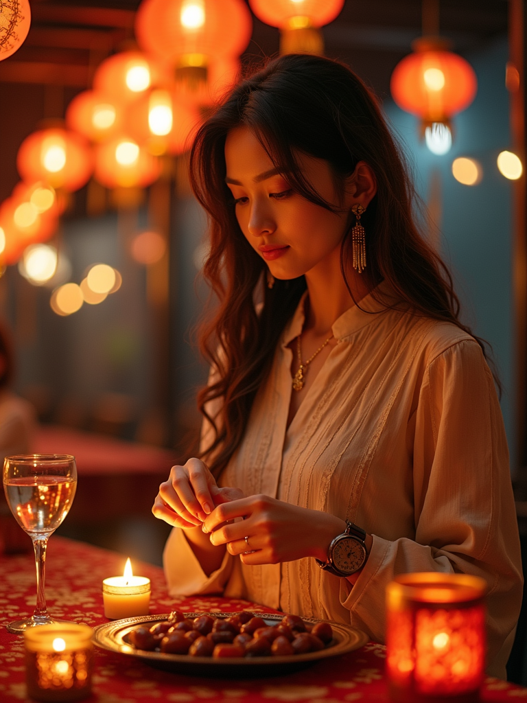 an incredibly attractive model during Ramadan evening celebrations, surrounded by glowing fanous lanterns, preparing for iftar with dates and water on a beautifully decorated table