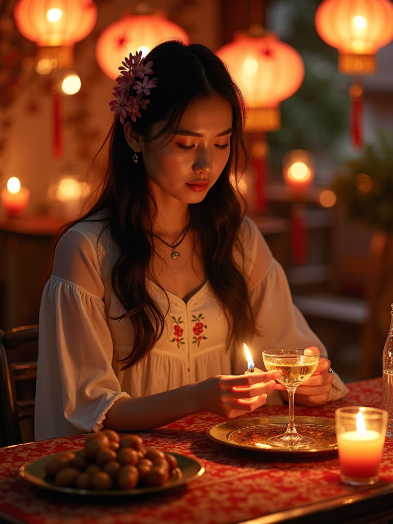 an incredibly attractive model during Ramadan evening celebrations, surrounded by glowing fanous lanterns, preparing for iftar with dates and water on a beautifully decorated table