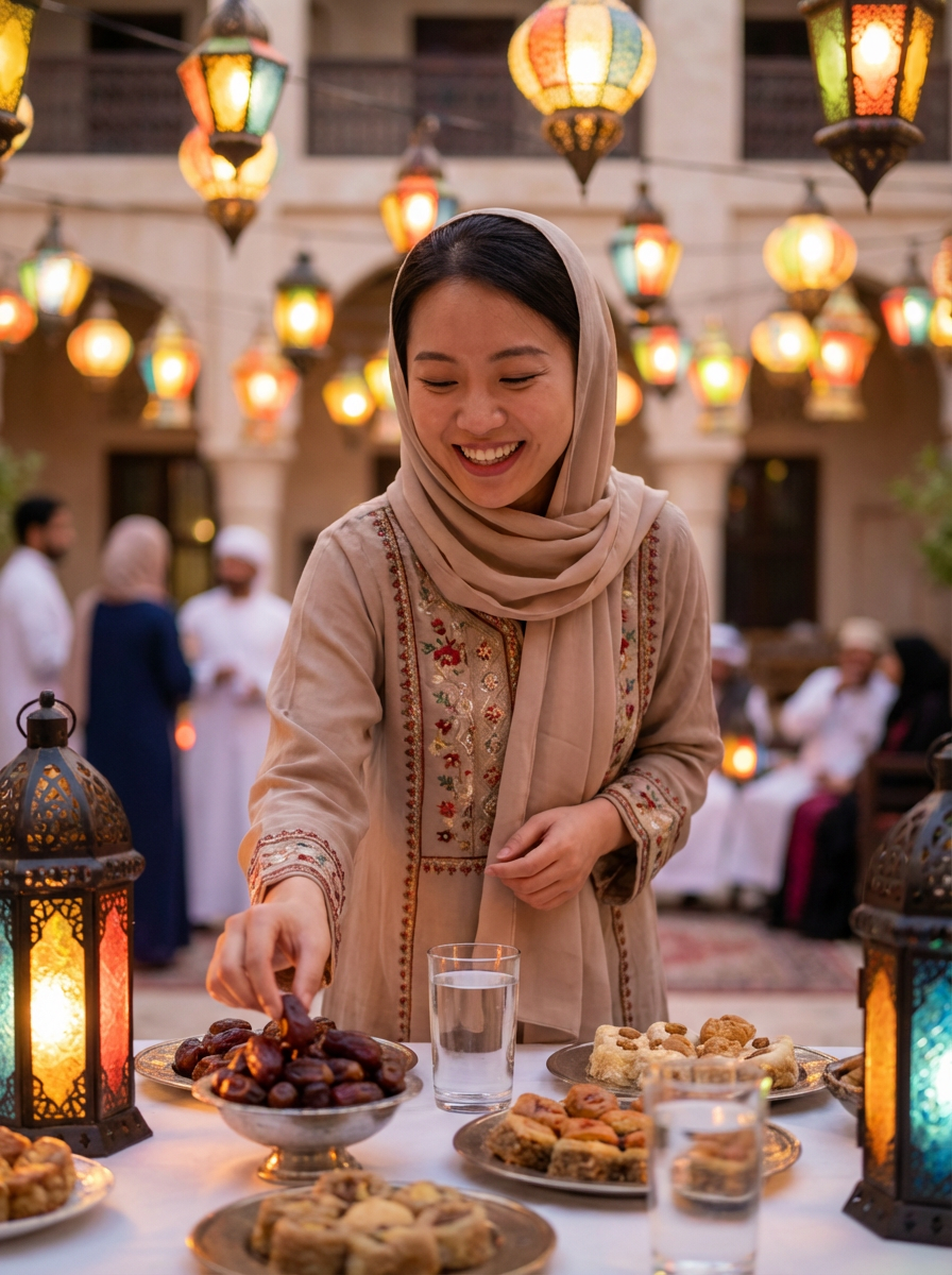 an incredibly attractive model during Ramadan evening celebrations, surrounded by glowing fanous lanterns, preparing for iftar with dates and water on a beautifully decorated table