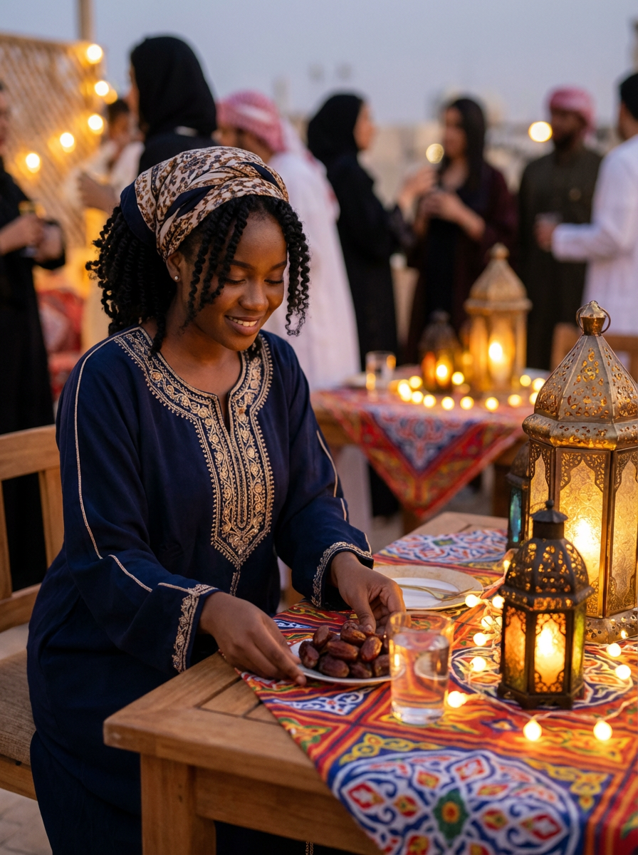 an incredibly attractive model during Ramadan evening celebrations, surrounded by glowing fanous lanterns, preparing for iftar with dates and water on a beautifully decorated table
